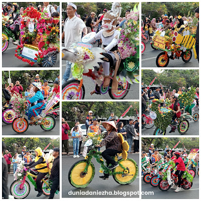 Tahun ini saya menyempatkan diri dan anak-anak melihat Semarang Merdeka Festival Flower 2024. Acara dimulai dari Balaikota menuju lapangan Pancasila Simpang Lima. Barisan pertama adalah drumband dari Akademi Kepolisian. Dilanjutkan oleh rombongan sepeda hias anak-anak dipimpin oleh sepeda mba Ita, walikota Semarang. Selanjutnya kendaraan roda 3 yang dihias bunga dan dedaunan. Tapi bukan Indonesia kalau tangannya bisa dikondisikan. Mendekati lampangan Pancasila, beberapa tangan menarik bunga dari kendaraan hias yang lewat. Duh, buk buk. Meh nggo opo jal kembange? Lagian beberapa bunga juga sudah layu. Semarang menyala. Sampai sore saja masih panas banget. Ada wortel dan kacang panjang yang juga sudah keriput.